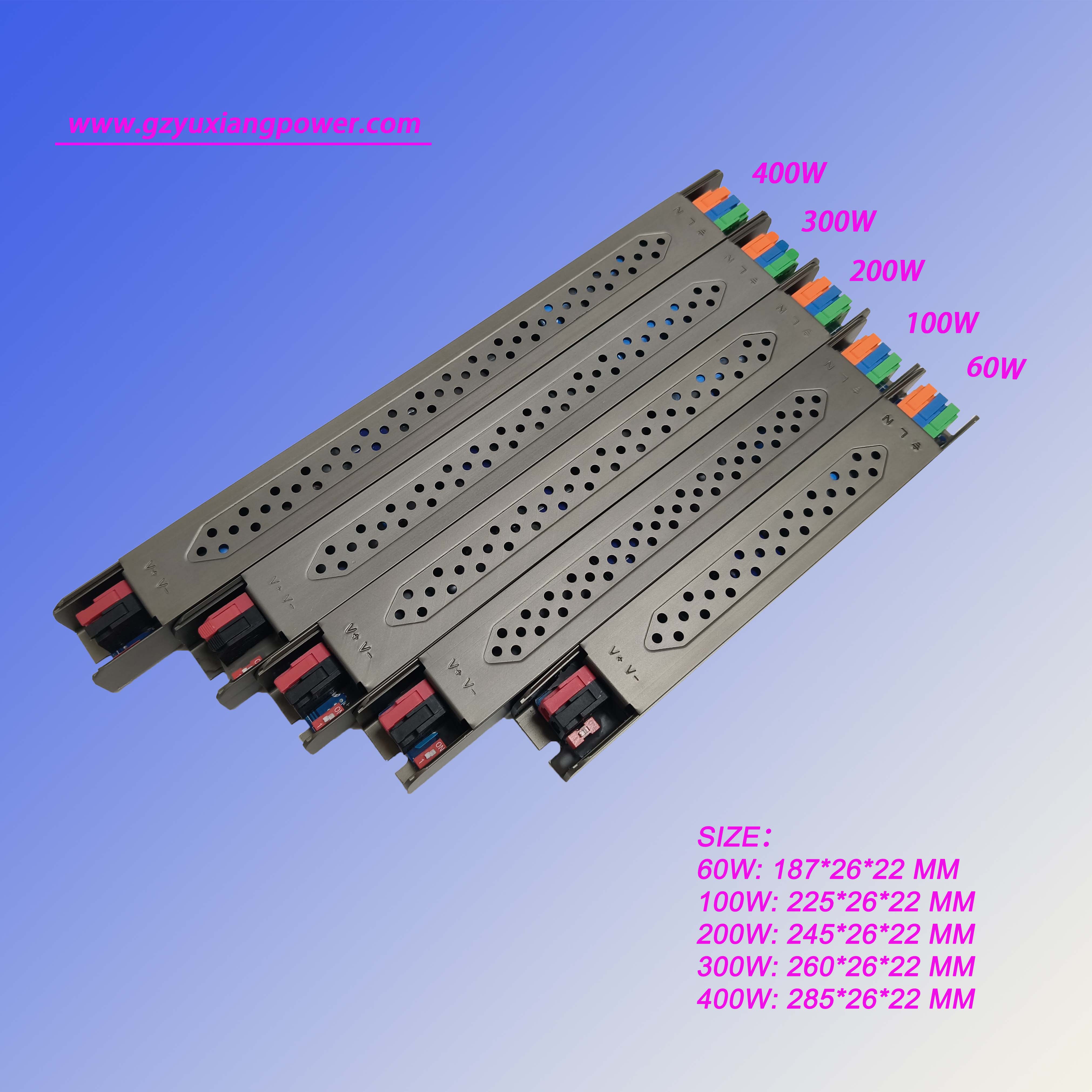 4. Αυτό το εξαιρετικά στενό ρυθμιζόμενο τροφοδοτικό LED προσφέρει ονομασίες ισχύος που περιλαμβάνουν 60W,100W,200W και400W, καλύπτοντας διαφορετικές απαιτήσεις ισχύος από συμπαγείς χώρους έως έργα μεγάλης κλίμακας.